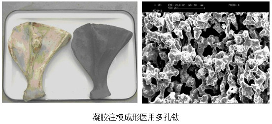 在金属粉末的凝胶注模成形方面,主要研究适合不同金属粉末凝胶注模成形的凝胶体系及添加剂获得高固相含量、低粘度的浓悬浮体,研究该浓悬浮体的流变性能、悬浮机理及凝胶化规律,为大尺寸(单重大于8kg)精密金属部件的低成本工业化生产打下良好基础。已实现不锈钢、钛合金、铝合金、硬质合金、铜合金的近净成形。最为重要的是,突破了凝胶注模钛合金低间隙控制和活化烧结技术,实现凝胶注模成形高性能Ti6Al4V钛合金,其致密度达到99%,氧含量0.28wt.%,碳含量0.15wt.%,抗拉强度1029MPa,屈服强度913MPa,延伸率15%,已达到美国ASTM粉末冶金钛标准。