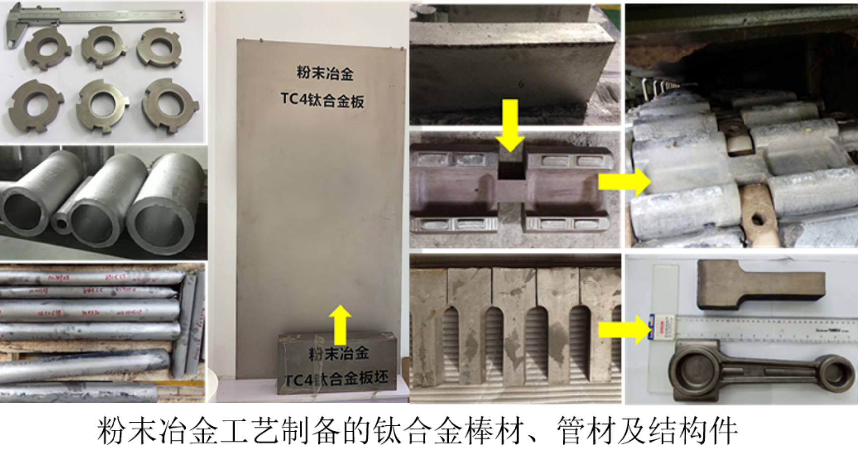 研发室多年来一直从事钛及钛合金粉末制备、先进近终成型以及粉末固结技术研究工作。目前已形成了具有独立自主知识产权的完备核心技术体系,正将研发成果向军品、民品市场推广,已获得重大进展。通过严格的控氧制粉技术,获得了粒度≤10μm、氧含量≤1000ppm的钛合金粉末;通过冷等静压技术结合真空烧结工艺制备了相对密度大于99%的Ti-6Al-4V合金烧结态材料,其氧含量≤1000ppm、氮含量≤200ppm,氢含量≤100ppm。烧结态材料抗拉强度≥950 MPa,屈服强度≥880 MPa,延伸率≥14%。经锻造后抗拉强度≥1030MPa,屈服强度≥980MPa,延伸率≥16%,同时还具有较高的疲劳性能(低周疲劳强度>800 MPa)。成分和性能均达到了ASTM B348中钛材的要求。同时,采用精密锻造技术对近成型的烧结钛锭进行超高温锻造,制备了复杂形状的钛合金构件,包括特种车辆履带板和汽车连杆等。