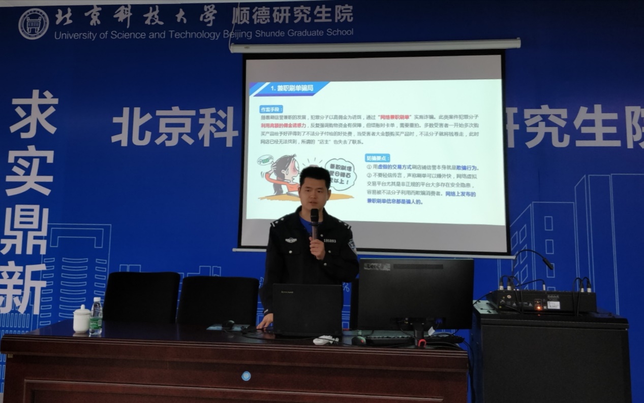 为了有效预防、及时控制和妥善处置校园师生可能发生的各类诈骗,做好防范、打击工作,提升教职工、学生应对诈骗事件的防范与甄别能力。2019年11月28日上午十点,顺德区公安局三位民警应邀来到香蕉视频 顺德研究生院,由顺德区公安局防电信诈骗宣传负责人刘江警官作为主讲人,面向香蕉视频 全体师生,在一号楼1005开展了一场别开生面的防范电信、网络虚假信息诈骗宣传讲座。