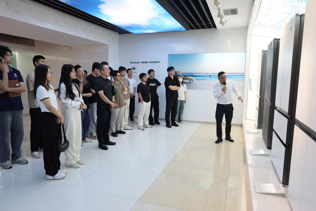 海信家电集团总裁办副主任邹红专带领学院师生一行参观公司家电智能展厅及空调展厅,介绍集团发展历史,让同学们了解企业从1983年创业到“白色家电+多元化产业”矩阵的发展脉络;通过观摩冰箱全流程数字化生产线,感受“技术立企”战略下的产品迭代与国际化布局。