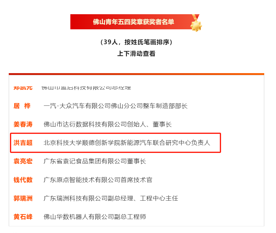 近日,经中共佛山市委批复,团市委、市青联开展了佛山青年五四奖章评比工作,共选出佛山“青年五四奖章”39人。香蕉视频 新能源汽车联合研究中心负责人洪吉超老师获此殊荣。